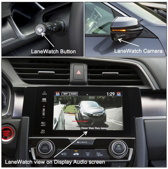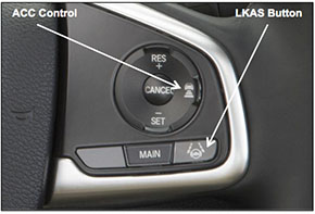 LKAS may be activated and deactivated using a switch located on the lower right part of the steering wheel (see Page 84). The system will suspend operation after several seconds if the driver takes his or her hands off the wheel, accompanied by a visual warning in the MID, resuming when the driver makes a steering input. See the 2016 Civic LKAS Animation for an active representation of system operation.