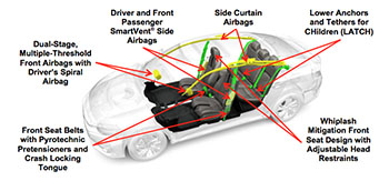 Standard passive-safety features such as a new driver's Spiral Airbag and a new front passenger's safety vent airbag, SmartVent® front side airbags, and side curtain airbags with rollover sensor help protect occupants in a collision. In addition, the greater use of high-strength steel and advanced crash engineering features, including its Advanced Compatibility Engineering™ (ACE™) body structure, new crash stroke front frame rails, and tailor-tempered B-pillars and rear frame structures, helps better protect occupants in a collision while minimizing weight for superior fuel efficiency.