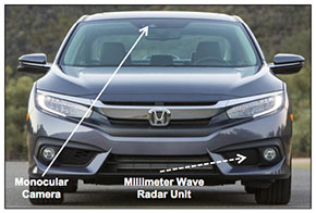The monocular camera recognizes lane features and identifies the lane. If the RDM system determines that the Civic is about to leave a detected lane, it will provide steering assist (primary) and in rare occasions when steering assist is not sufficient to avoid leaving a lane marked by a solid line, braking assist, to help the driver stay on the road. RDM is integrated with the Vehicle Stability Assist (VSA) system to provide moderate braking, and with the Electric Power Steering (EPS) system to provide steering input.