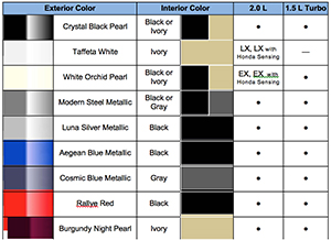 | Exterior Color | Interior Color | 2.0 L | 1.5 L Turbo |