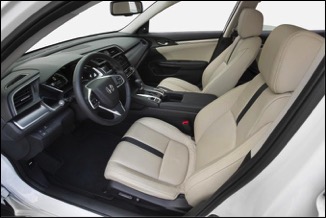 The Civic's all-new front bucket seats are designed to provide welcoming support for a wide range of body types, along with secure lateral support for cornering. New seat frame designs are 17-percent lighter, more comfortable and more adjustable. A relocated seatback recline pivot point improves comfort, and the range of the seat bottom height adjustment has been increased by 10mm (0.4 in). A new available adjustable thigh support for the driver's seat offers 14-degrees of tilt. To help improve the forward view and create a feeling of openness for rear seat passengers, the front seatbacks have a narrower upper profile and smaller headrests. The Civic seats feature fabric seating surfaces in LX, EX and EX-T trims, with leather-trimmed seats in the EX-L and Touring trims, using perforated leather on select areas of the front seats.
