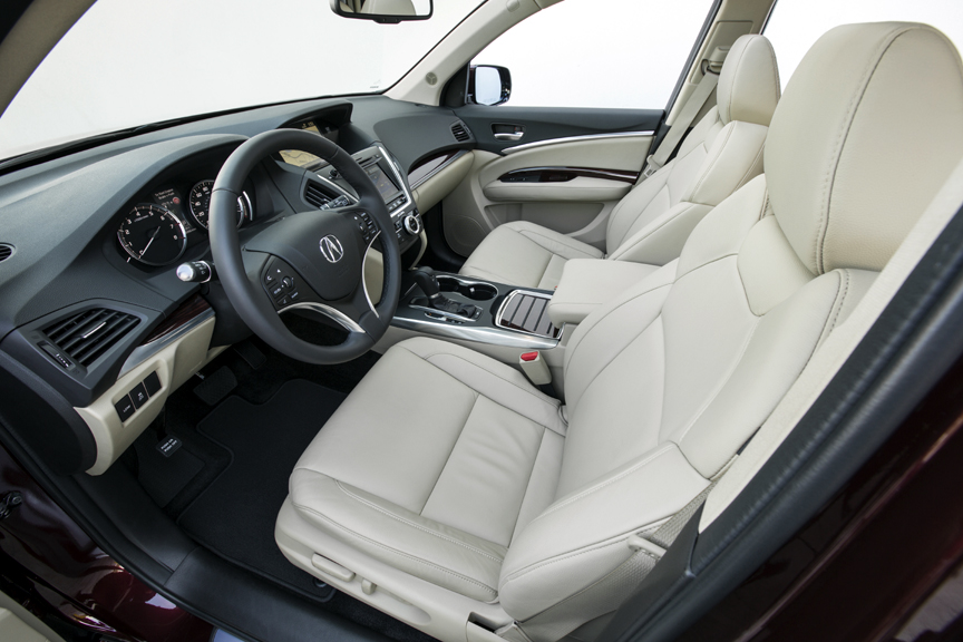COMFORT: As outside, the MDX's interior strikes a fine balance between simplicity and complexity. Visual boredom is banished, but function is never sacrificed for form. Even in "base" trim all of the expected contemporary luxuries are standard, and there should rarely be a reason to take the "key" fob out of your pocket with pushbutton start/stop and proximity door un/lock. The main instruments are brightly lit and easy to read. An information display between the speedometer and tach shows fuel, range, tire pressure, and other useful information; further information and data features are available through the display at the top of the center stack or another one below it. Yes, you could think of your MDX Advance as a large mobile device… The interface to the navigation, Bluetooth phone, audio, and information systems has been simplified, with hard buttons for main features and a touchscreen interface for details. All contemporary audio choices are available -- AM/FM/SiriusXM radio, CD, hard disc, external player via jack or USB, and streaming audio via the Bluetooth connection. Looking for the shift lever? There isn't one -- it's been replaced by a series of buttons, with a lift switch for reverse. It takes up the same amount of space on the console as a traditional shifter, but does allow easier access to the front of the console and lower part of the dash.