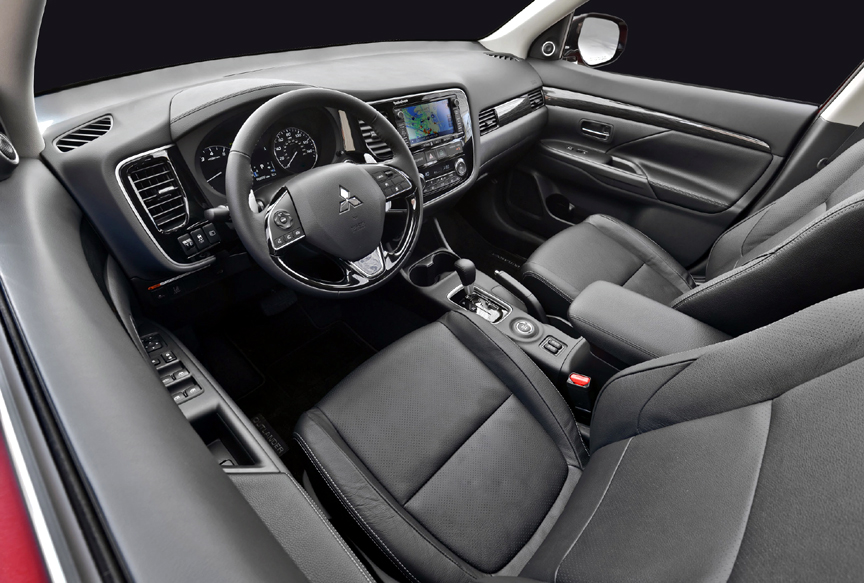 COMFORT: Interior design is clean and simple. Soft-touch materials are used for upper surfaces of the instrument panel and door, and all levels get a leather-wrapped steering wheel with tilt- and reach-adjustment. The instrument panel face is an attractive gloss black with metal-look binding. At GT level, appointment level is upscale, with leather seating surfaces, heated in front, and a power-adjustable driver's seat. Instruments are brightly-lit and easily visible, and positioned well. GT cabin electronics include a 710-watt Rockford-Fosgate audio system with AM/FM/XM radio, CD, SD card, and USB inputs, plus Bluetooth streaming, and a comprehensive information system, with an altimeter even. The Touring Package adds navigation. Dual-zone climate control is thankfully not integrated into the touchscreen interface for audio and information systems. Front seat comfort is very good. Depending on fore or aft position, the second row can be business class or not, and because it's minimally contoured three people can fit comfortably. The third row is good for people up to about 5-6 if the second-row passengers are not too long of leg. Headroom is unlikely to be a problem, and a bit of second-row seatback angle adjustment adds comfort there. There is useful storage around the interior, including bottle holders and pockets in all doors. The Outlander's only "traditional truck" attribute is a good one -- the space-saver spare is outside, underneath the rear where it doesn't take up interior space.