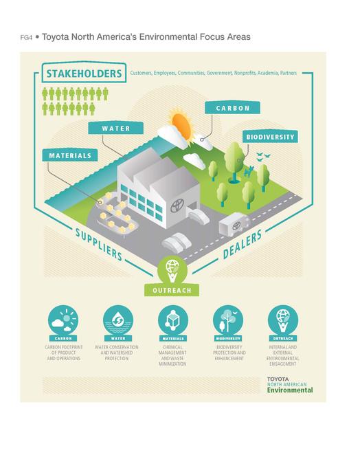 Five priority issues - carbon, water, materials, biodiversity, and outreach - guide Toyota’s efforts in North America. Here are a few highlights from each: