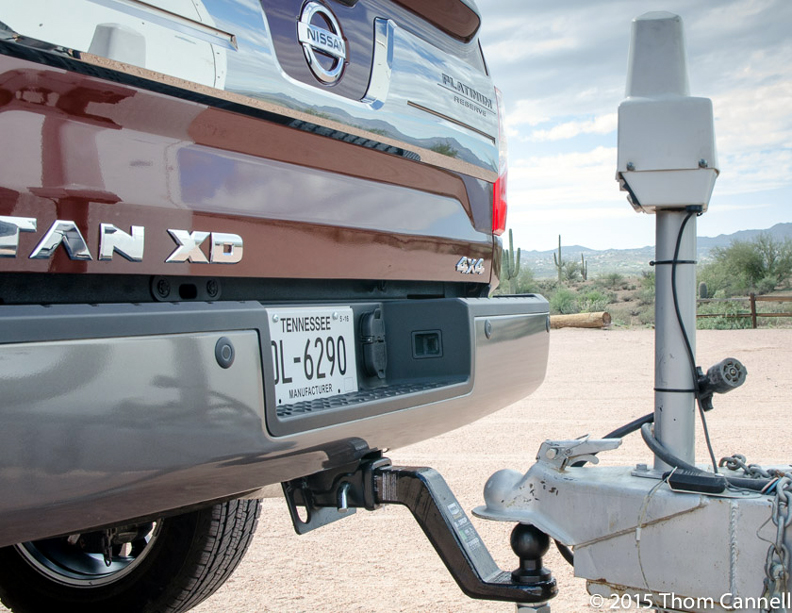 As a truck designed to tow, Titan can arrive ready for a goose neck hitch or fifth wheel with an available adaptor. It uses the Nissan Around View system display the immediate area when a single driver has no one to assist. With a few button-pushes you’ll view a backup camera screen that imposes both Left-Right track movement (the path the steering wheel will take you) with a stable projection of the truck’s center line. Of all the features, and it isn’t unique, with no fuss at all we quickly and easily positioned the ball under a trailer hitch and we did it on the first try. We were off Left-Right perfection by 0.30” and dead center front-to-rear! After that we tried Nissan’s patented trailer light detection system. Pressing on the remote lock button once, than twice and hold, first honked the horn, then the 7-pin lighting connector delivered electricity in sequence to the turn signals, the backup lights, the stop lights, and marker lights. Hey, you can do it All By Yourself, which is both cool and useful.