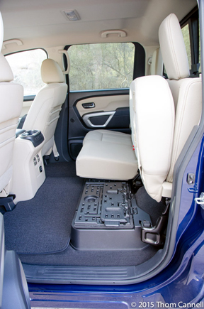 Interiors received similar analysis, the theme “a grand control structure” that placed everything to hand beginning with a significant change, relocating the gated shifter to the steering column. Titan was the first with a gated shifter, which now you’ll find almost everywhere. But, a large “but”, that feature wastes prime storage space and the reclaimed space delivers more and larger (up to two 32 oz bottles) cup holders in the center plus larger bins to fit file folders or laptops.