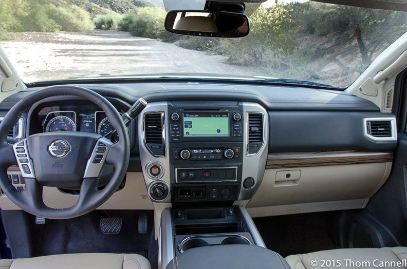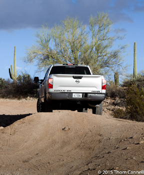 Like all heavy duty trucks, Titan has a solid rear axle yet felt as, or more comfortable than those well established brands. We even goofed and took our Pro4X on an extensive off road coarse through the Arizona hillsides while laden with three people and a 750 pound load in the bed. The truck handled it the way you’d want it to. Actually, we missed the load drop point and despite moving as quickly as the terrain would allow we only put the truck onto the bump stops once! That was impressive—and the bump stops felt very compressive, not jarring. The truck is impressively solid, we’d expect nothing less in 2015, and we think it looks as good as it performs.