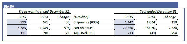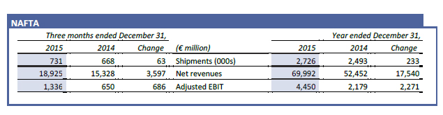 - Adjusted EBIT1 was €5.3 billion, up 40% from €3.8 billion in 2014, with NAFTA more than doubling and EMEA returning to profitability one year ahead of plan. All segments were profitable in Q4 2015.