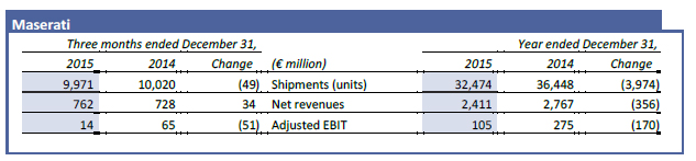 - Maserati performance improving in second half of 2016 following Levante launch
