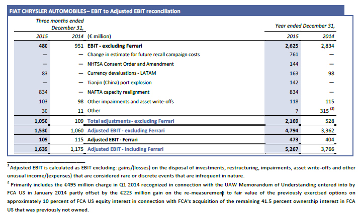 Adjusted EBIT excludes total charges of €1,631 million consisting primarily of two items. As part of the NAFTA margin improvement plan, the Group will realign a portion of its capacity in the region to better match market demand. As a result, pre-tax charges of €834 million were recognized and excluded from Adjusted EBIT in Q4 2015, including asset impairment charges of €598 million and other charges of €236 million related to the extended downtime at certain plants associated with the implementation of the new industrial plan. Given the recent increase in both the cost and frequency of recall campaigns, the Group revised its actuarial methodology for the estimate of future recall costs during Q3 2015. As a result, an adjustment of €761 million was recognized in Q3 2015 for the U.S. and Canada related to the change in estimate of future recall campaign costs for vehicles sold in prior periods, which was excluded from Adjusted EBIT.