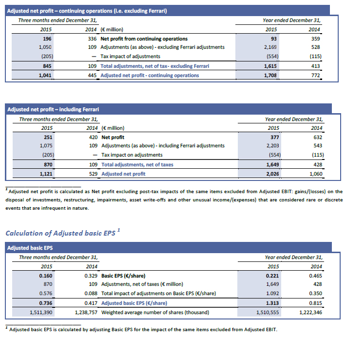 1 These results include Ferrari to promote comparability with prior periods and previously provided guidance. However, as a result of the approval of the Ferrari spin-off at the Extraordinary General Meeting of Shareholders on December 3, 2015, Ferrari will be treated as a discontinued operation for the year ended December 31, 2015 financial statements and for all prior periods in accordance with IFRS. In addition, Ferrari assets and liabilities will be classified as held for distribution at December 31, 2015;