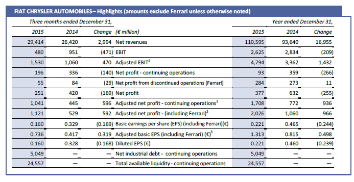 FCA closed 2015 with a strong performance well in excess of full-year guidance. Including Ferrari, Net revenues were €113.2 billion, up 18%, Adjusted EBIT was €5.3 billion, up 40% and Adjusted net profit was €2.0 billion, up 91%. The spinoff of Ferrari allowed the Group to begin 2016 operations with Net industrial debt of €5.0 billion.