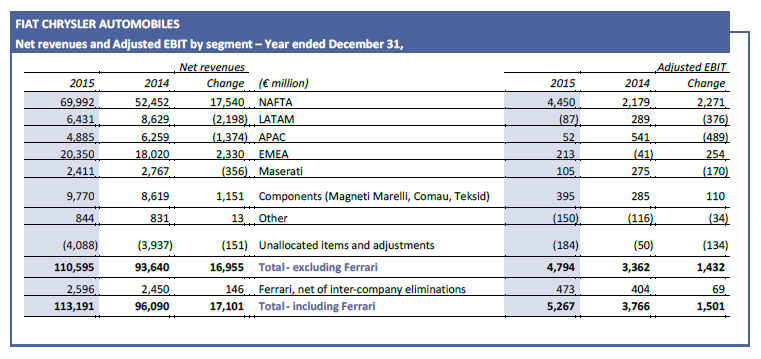 Adjusted EBIT was negative €87 million in 2015, down from €289 million in 2014, primarily related to lower volumes and higher input cost inflation, Pernambuco start-up costs and the all-new Jeep