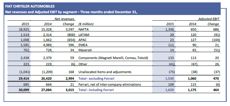 Adjusted EBIT of €4,450 million, compared with €2,179 million in 2014, reflects higher volumes, positive net pricing and positive foreign currency translation effects, partially offset by increases in recall accrual rates and product costs in the second half of the year for vehicle content enhancements, net of purchasing efficiencies. The NAFTA Adjusted EBIT margins for 2015 of 6.4% (4.2% margin in 2014) and 7.1% for Q4 2015 both exceeded their respective targets.