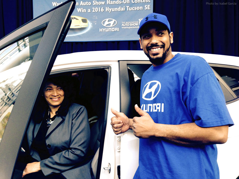 Washington Auto Show January 31, 2016; The only thing more stunning than the moment that William Holmes picked the lucky key that switched on the ignition of his brand new Hyundai Tucson was what happened moments later. After six days and five nights of nearly continuous contact with the prize vehicle in The Washington Auto Show’s Hyundai Hands-On Contest, Holmes of Mitchellville, Md. held the key to the brand-new Hyundai Tucson high above his head – and handed it over to his mother, Margaret Holmes. “I couldn’t think of a greater gift to give my personal hero than a stylish new means of transportation to aid her in assisting others within her community,” Holmes wrote in his contest application essay, distinguishing him as one of nine finalists from more than 500 applicants to the beloved annual contest.