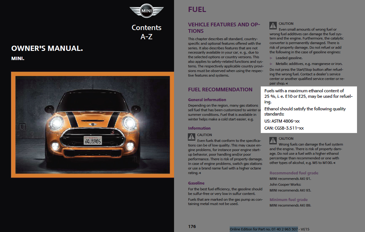 AUTO CENTRAL - February 1, 2016: The Auto Channel received confirmation today from Urban Air Initiative and RFA (Renewable Fuels Association) that the latest model MINI hard top is approved by MINI and BMW to run on E25 fuel - 25% ethanol blended with gasoline. Although it's just one model out of dozens available to American consumers, this represents a huge victory for proponents of ethanol since E25 contains more than twice the volume of ethanol compared to standard E10. This is also welcome affirmation to those who have long known the truth about ethanol-gasoline blends in non-flex fuel vehicles; that modern non-flex fuel cars and light trucks can safely, efficiently, and economically use higher ethanol-gasoline blends than E10 or E15 (10% and 15% ethanol, respectively). Many proponents of ethanol, like The Auto Channel's Marc Rauch, have regularly used ethanol-gasoline blends up to and over E50 in their non-flex fuel cars.