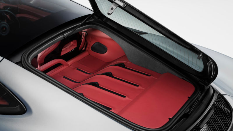 The front luggage area remains unchanged from the 570S Coupe at 5.3 cubic feet (150 liters) of space, while the 570GT adds a further 7.8 cubic feet (220 liters) of storage on the leather-lined Touring Deck. This area is accessed via the side opening glass hatch, and brings total storage capacity of the 570GT to 13.1 cubic feet (370 liters). The glass hatch opens on the curbside (whether left-hand or right-hand drive) and is framed by carbon fiber, which provides significant torsional rigidity.