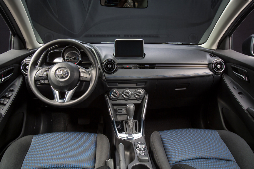 Being (for the rest of the model year) a Scion means "mono-spec" trim packaging. With alloy wheels, keyless entry and pushbutton start/stop, power outside mirrors with integral LED turn signals, variable-speed wipers and a rear window defogger, air conditioning, a backup camera, power windows and locks, full instrumentation, a tilt- and telescope-adjustable steering wheel with audio, information, an cruise controls, a seven-inch touchscreen for audio -- which means streaming Bluetooth audio as well as AM and FM radio and external inputs -- among the standard equipment, it's very well-equipped. Dealer-installed add-ons include wheel locks, rear bumper applique, and an SD card based navigation system.