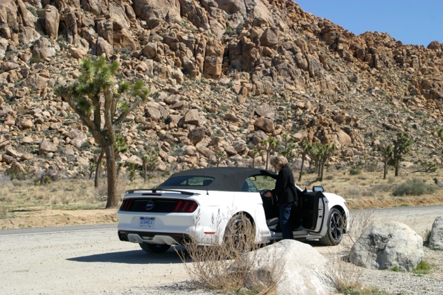 We stopped along the scenic two-lane road in the Joshua Tree National Park to shoot this remarkably photogenic sporty car. White is a great color for this car (he said with total subjectivity) and with the California trim it includes cool black and silver, 19-inch aluminum wheels making for striking contrasts that accentuate classic mustang design details. With each update of the Mustang’s styling the Ford designers have managed to maintain a distinctive character that leaves no doubt as to its heritage. Some of the rental agencies offer the Mustang convertible so there were plenty around but ours still garnered admiring looks and comments.