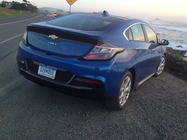 While watching the sunset from a sandy bank just above the sedentary seals (they call this a “rookery”) we photographed the car. This new Volt benefits visually from a major restyling. The exterior is much improved with crisp, coupe-like styling that makes it look more conventional. Inside it looks and feels a good measure upscale with nicer interior trim, redesigned dash, better seats, a third seating position in the rear (on some models) and more technology throughout.