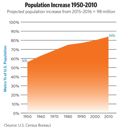 The study on urbanization explores the effect of certain trends on vehicle ownership and fuel demand. Back in 1950, only 56% of Americans lived in metropolitan areas; but by 2010, that number had jumped to 84%. If this trend continues in lockstep with the population increase projected over the next 45 years, our urban centers are likely to become more densely populated and geographically large as they swell.
