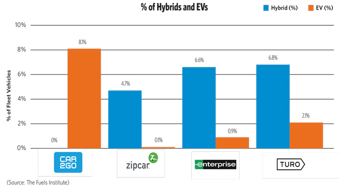 The car-sharing companies profiled in our report have more alternative fuel vehicles than the national average; the rate of hybrids or electric vehicles in their fleets range from 4.7%–8.1%. The Fuels Institute does not have a current report on the registration of these vehicles, but by comparison, according to WardsAuto, in 2015 hybrids, plug-in hybrids and electric vehicles combined accounted for just 2.8% of total light-duty vehicle sales.
