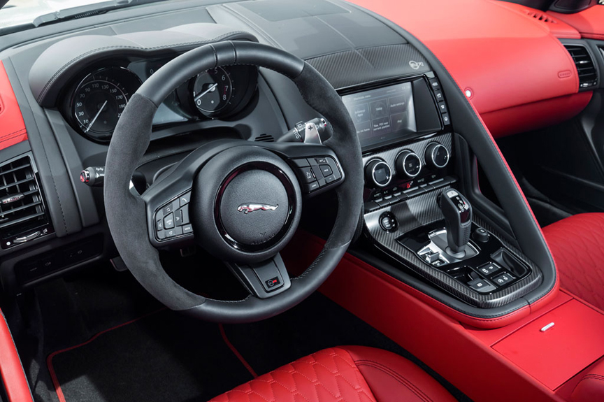 The F-Type SVR has 25 hp more and 55 pounds less weight compared to the F-Type R that is already very potent. With the CFRP (carbon fiber) roof and after recalibrating the 5.0-liter V8 supercharged engine for the SVR, it produces 575 hp and 516 pound-feet of torque (700 Nm), 14 lb-ft more than in the R. Therefore, it is no surprise that the SVR beats the R in the sprint from 0-60 mph. With 3.5 seconds, it is 0.4 sseconds faster than the F-Type model. The top speed of the Coupe is 200 mph (322 km/h). The Convertible reaches 195 mph (314 km/h) The ‘R’ will bear the speed crown until the SVR hits the markets in the second half of this year.