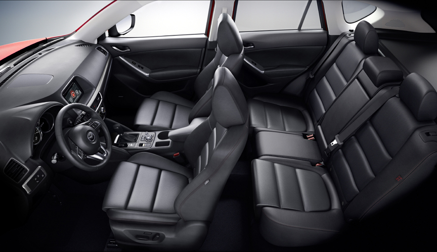 SAFETY: All CX-5 models get strong safety-oriented unibody construction, front, front-side, and full-length side curtain airbags, and a tire pressure monitoring system. Brakes are four-wheel disc, antilock of course, with electronic brake-force distribution, brake assist and Dynamic Stability Control. Touring and Grand Touring get a blind spot monitoring system that illuminates a spot in the appropriate outside mirror and sounds a chime when a vehicle is in range to the side of the CX-5. The system also alerts for rear cross traffic. Optional are LED headlights that adaptively turn a little in the direction of the steering wheel for improved night vision.