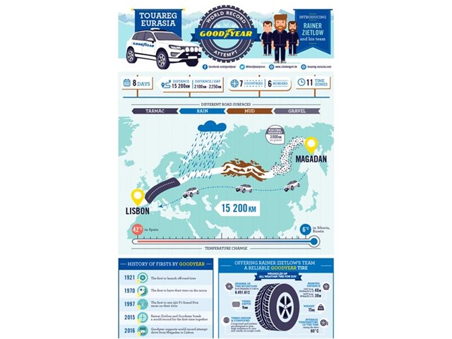 On June 30th , Rainer Zietlow will embark on his 15,200 km world record drive across Eurasia. In around 8 days , Rainer wants to drive from Magadan, the easternmost city on the Asian continent reachable by car, to Lisbon, the westernmost city on the European continent. As he did with his previous challenges, Zietlow will donate the funds he raises to the charity SOS Village in Belarus which he will visit after the world record run. With a long heritage of firsts, Rainer again choses Goodyear as the ideal partner for this world record attempt.