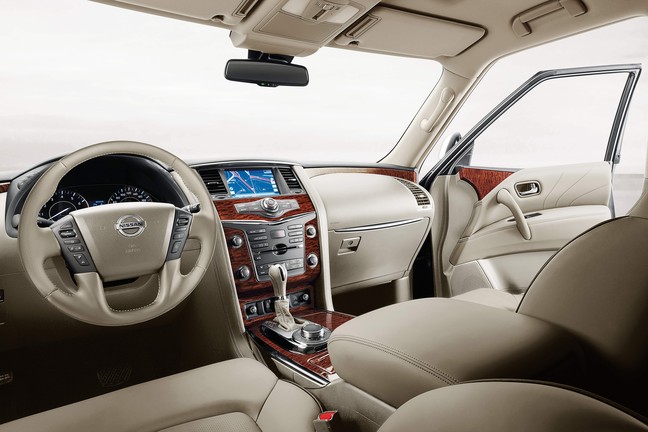 The body-on-frame Armada now employs a full-boxed frame that comes from the global Nissan Patrol SUV. There’s double-wishbone front and rear suspension with auto-leveling rear shocks. Powering the Armada is a new 5.6-L 390HP V8 driving through a seven-speed automatic. Max torque is up over the previous Armada with more torque at lower RPM and it stays flat over a wide range. There’s a choice of rear-wheel or four-wheel drive. The 4WD system has a low-range and can send 50 percent of the torque to the front wheels when slip is detected.