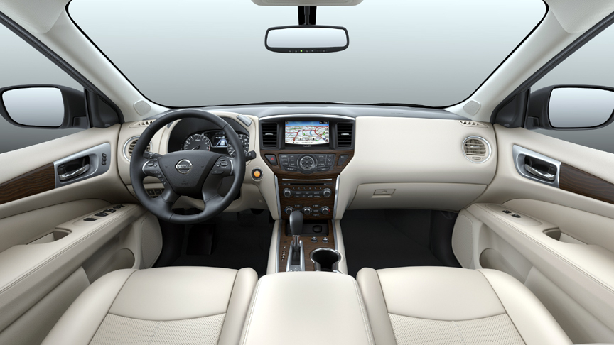 The 2017 Pathfinder is offered in S, SV, SL, and Platinum trim levels, with front- or multi-mode all-wheel drive. All, even the S, are seven-passenger spec, with a folding two-place third row that is roomier than usual for a mid-size SUV. A new, larger touchscreen, rearview camera, Sirius/XM satellite radio, Bluetooth and USB connectivity, hands-free text messaging, bright “Fine Vision” instruments, cruise control, tri-zone automatic climate control, pushbutton start/stop, remote keyless entry, and more are standard, even in the S, with more standard equipment and towing, cold weather equipment, navigation and electronic safety systems, and upgraded audio system packages offered on the SV and SL. Everything is standard in the Platinum, with only a rear-seat entertainment system and various port- and dealer-installed accessories optional.