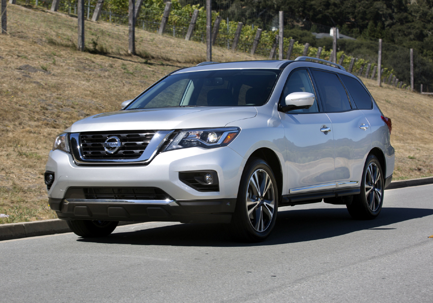 My test car this week is a new Pathfinder Platinum in 4WD trim. Platinum means that everything optional in lesser levels — trailer towing equipment, navigation, Bose audio, panoramic moonroof, and more — is standard. The only option is the “Family Entertainment Package” of eight-inch screens at the rear of the front-seat headrests and DVD plus HDMI, VTR, and USB connections to such. As equipped, it’s a comfortable and roomy family and stuff hauler. The extra power is welcome, never a problem dealing with traffic. The suspension and steering improvements mean a pleasant ride quality and surprisingly good maneuverability and ability in corners. It’s small enough outside that it fits easily into the average parking space, but second- and even third-row passengers are not unduly cramped. And it has all the modern conveniences, connectivity, and safety equipment. And the ability to tow 6,000 pounds.