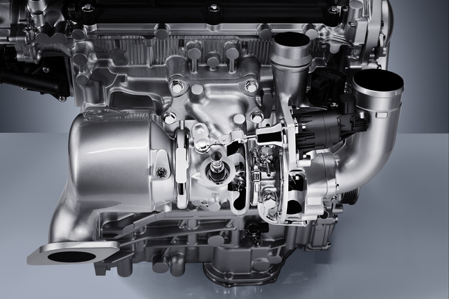 | Construction | Aluminum block with arc-sprayed mirror coating to cylinder bores, aluminum cylinder head with integrated exhaust manifold, single-scroll turbo with intercooler |
