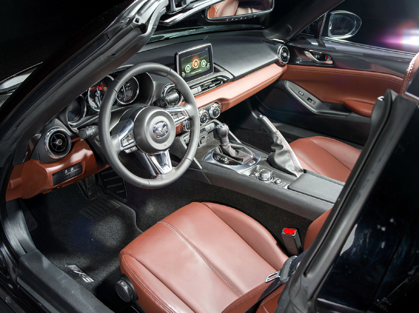 MX-5 RF Grand Touring models feature heated leather seating surfaces, Adaptive Front-lighting System, High Beam Control and Lane Departure Warning.