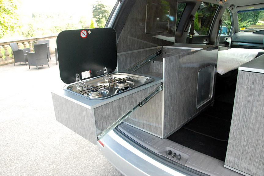 The campervan comprises a colour-matched elevating roof, driver and passenger swivel and folding seats to create twin beds with in-fill cushions and memory foam toppers, a rear tailgate awning, sliding glass top hob for indoor or outdoor use, small sink, gas bottle, 12v charging system, 25ltr compressor fridge, fresh and waste water containers, portable toilet, and all woodwork made from light weight ply.