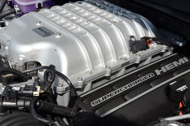 On an acceleration run the supercharger’s whine lets you know things are happening. At full throttle, the supercharged Hemi Hellcat engine can suck the air out of a 10-by-13-by-8-foot room -- about 1,040 cubic feet of air -- in 1 minute.