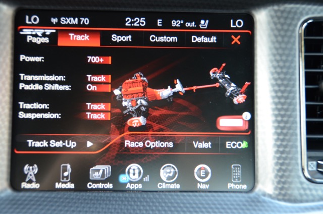 SRT Drive Modes allow the driver to tailor their driving experience by controlling horsepower, transmission shift speeds, steering, paddle shifters, traction and suspension. Drive Modes are pre-configured for Sport, Track and Default settings, while Custom mode lets the driver select their favorites.