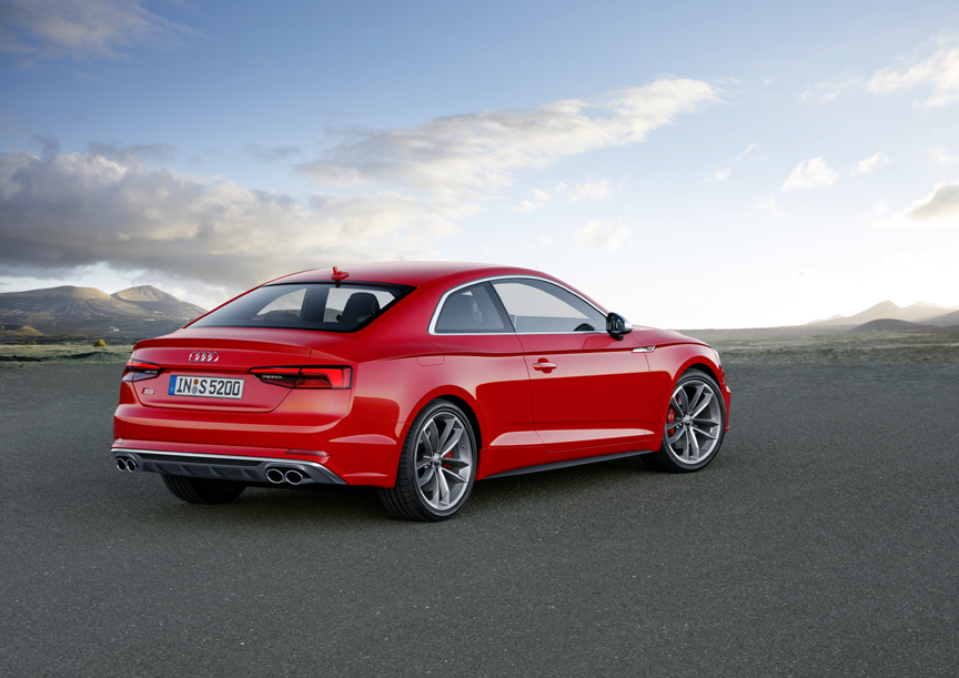 The exterior of the A5 and S5 coupe has been redesigned to feature more dramatic shapes and sharp lines. Classic design details such as the hood power dome, strong shoulder line and pronounced wheel arches add elegance and emotion to the already sporty character of the vehicle. Slim, yet sculptural three-dimensional LED taillights offer a distinctly powerful look and emphasize vehicle width.