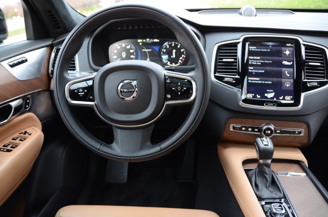Rather than a push button for the engine, the XC90 has a knob on the center console that is rotated for start and stop. There’s a knob for audio volume and all other controls are from the 9-inch Sensus center screen. This iPad-like command center for the XC90 takes a bit to get used to. It was recommended that I just sit, stopped in a parking lot and play with it to become familiar with all the menus and functions. Within a short time I was swiping left and right and up and down.
