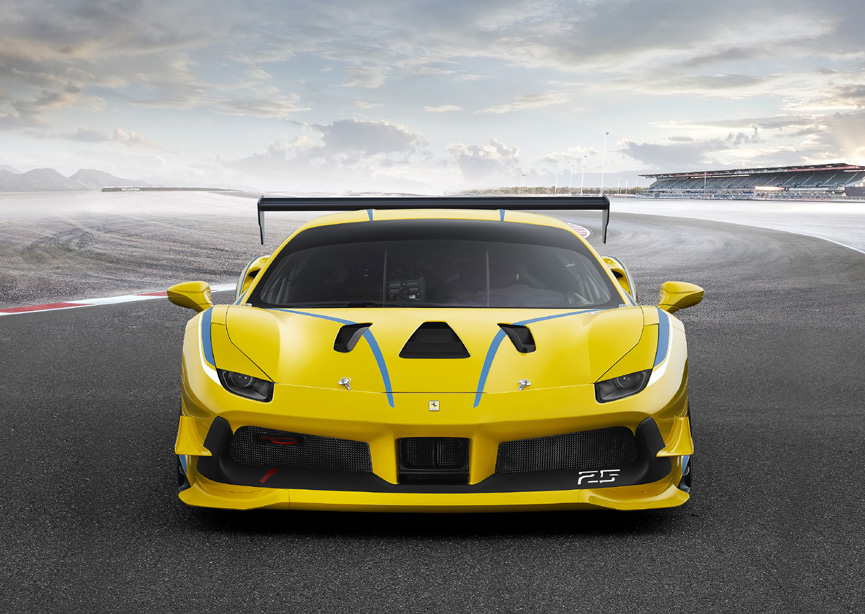 Compared to the production 488 GTB V8, the Challenge’s powertrain features specific engine mapping, optimised for racing performance, and shorter gear ratios. The variable torque management has been modified to prompt the driver to shift up at the ideal moment during longitudinal acceleration, thus making maximum use of the performance characteristics of the turbo engine. The F1 DCT transmission features a new racing shift strategy which enables the car to accelerate from a standstill to maximum revs in 4th gear in just six seconds. Further improvements include a reduction in overall powertrain weight.