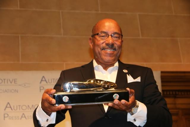 ![]() Legendary Auto Designer Ed Welburn Showing His Newly Designed North American Car and Truck of the Year Awards (NACTOY) Trophy (Photo by Bob Benko) |