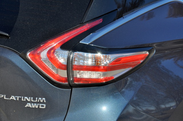 We had to park around the corner and way down the street. We approached the Murano as the daylight waned. That’s a good lookin’ CUV, for sure. This most recent redesign resulted in a much more dramatic style with sculpting more angular and distinct than anything in its class except perhaps the new Lexus RX. Our test car is a lovely dark blue but the intermittent rain on the way down has dulled it a bit. The big, 20-inch machined aluminum wheels, cool floating roofline and striking LED taillights set it off as something special.