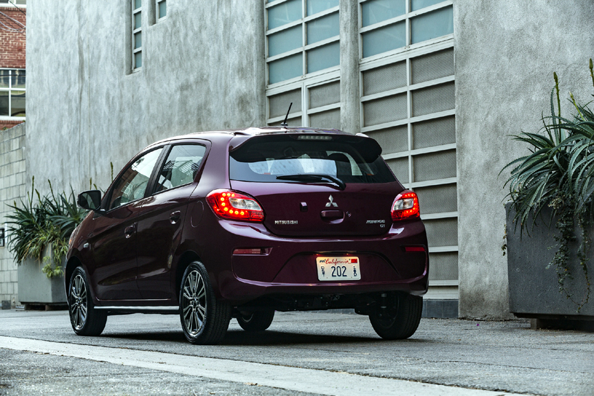 APPEARANCE: Space efficiency, size small. The Mirage is a classic example of a transverse front-engined, front-wheel drive hatchback, with a short hood, relatively large passenger cabin — with four doors for best passenger or cargo access — and small wheels pushed to the corners. It is wider than high, 65.6 inches to 59.4, and at under 150 inches / 12.5 feet long is easily parked. Its 2017 facelift has added a stylish chrome-trimmed grille above the front bumper and an angular bulge to the hood. Bright chrome trim below the front bumper adds further interest, and the GT gets HID headlights and LED running lights. The sides are slightly sculpted, as much for rigidity as style. A visor-type spoiler is found at the roof’s trailing edge, and large LED taillights are found in all examples.