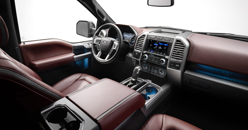 F-150 also brings two new seating trim colors – Dark Marsala for F-150 Platinum, while top-of-the-line F-150 Limited offers a Navy Pier environment. New trim offerings including carbon fiber appearance appliques on F-150 XLT Sport and Lariat Sport models, while the famed F-150 King Ranch features new Kingsville Appointed seats.