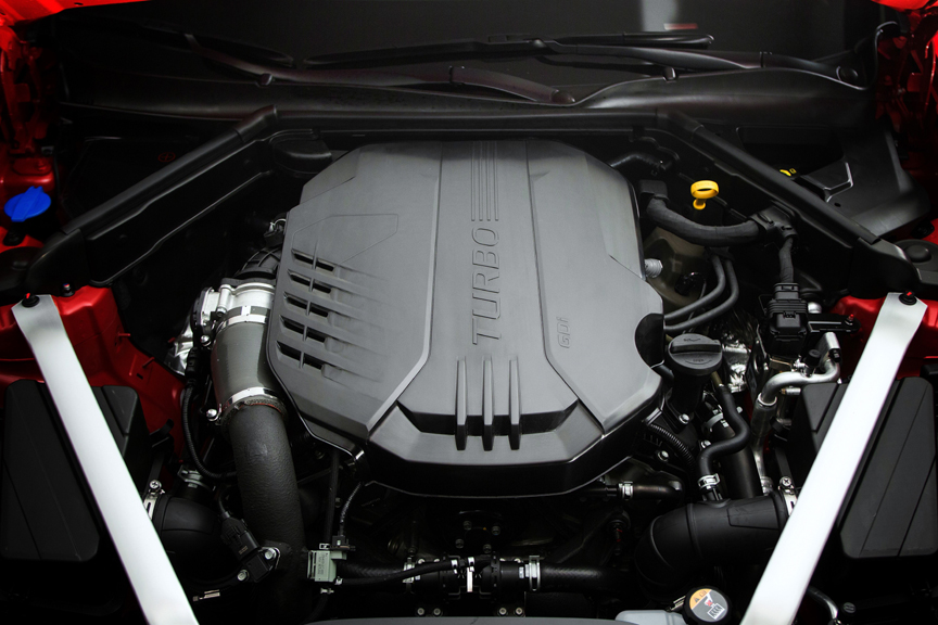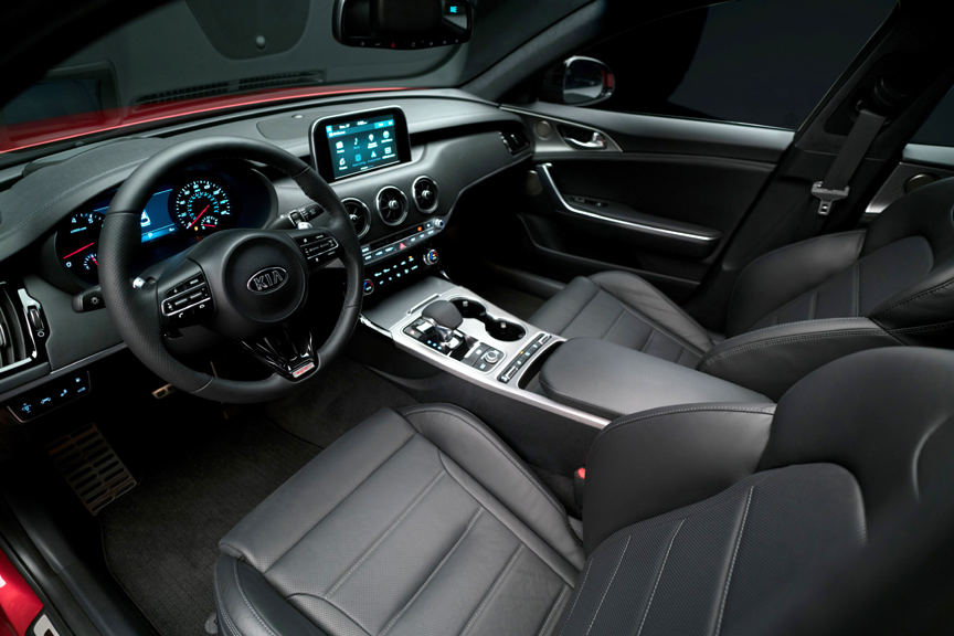 While both engines are still under development, the standard 2.0-liter turbocharged four-cylinder Theta II engine produces an estimated 255 horsepower at approximately 6,200 rpm. Max torque of 260 lb.-ft. is available from 1,400 – 4,000 rpm. Performance credentials are further enhanced through the available 3.3-liter twin-turbo V6 Lambda II engine, which is anticipated to produce 365 horsepower at an estimated 6,000 rpm and offer max torque of 376 lb.-ft. from 1,300 – 4,500 rpm. Kia is targeting 5.1 seconds to 62 mph and a top speed of 167 mph with the twin turbocharged V6.