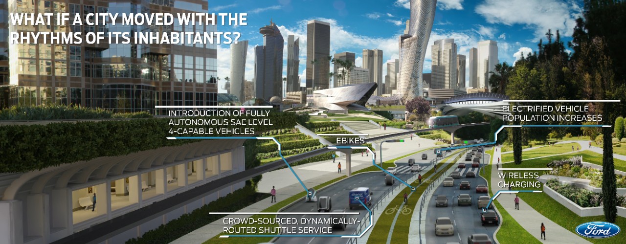 Ford’s City of Tomorrow looks at how near-term mobility advancements – including autonomous and electric vehicles, ride-sharing and ride-hailing and connected vehicles – interact with urban infrastructure and create a transportation ecosystem.