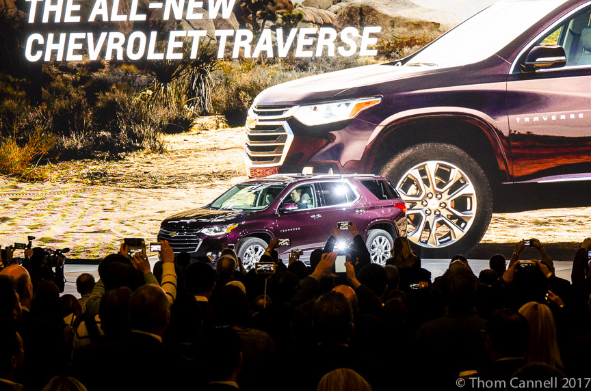 Then, at the Chevy stand they began by introducing Michigan’s U.S. Representative in Congress, Debbie Dingle and Lansing mayor, Verg Bernero, to tepid applause (not much love for politicians these days) before showing the new version of the 3-row crossover (7- or 8-passenger) Traverse, sister model to Buick’s Enclave and GMC’s Acadia, all built in Lansing. They’ve added everything the competitors have like hands-free tailgate, surround vision, and fold-flat floors with creative use of cubbies. But, they’ve reduced cargo space a bit. It’s still bigger than many other three-row haulers. Base powertrain, by the way, will be GM’s new 2.0-liter turbo.