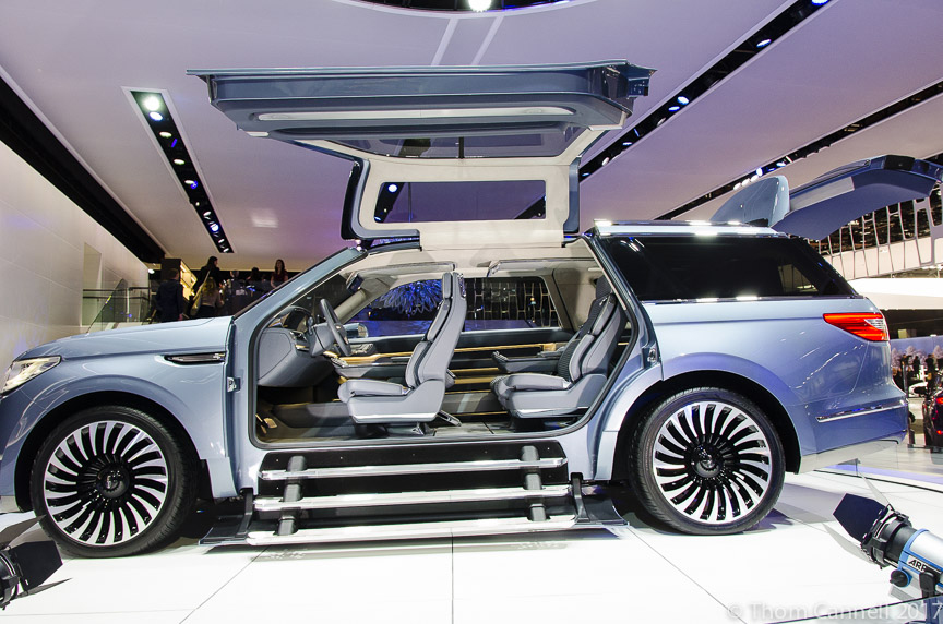 Over at Lincoln we saw a tarted-up version of what will be the new Lincoln Navigator. We’ll see it in production later this year. The current Navigator is as boxy as a milk crate and needs an update badly. We don’t have many details on content for this upcoming truck but they hope to compete better with Suburban and other big SUVs. We’ll see if Lincoln is up to the task. Don’t expect to see the gull-wing doors or three-step entry system shown here but the styling is what you’ll get, we’re told.