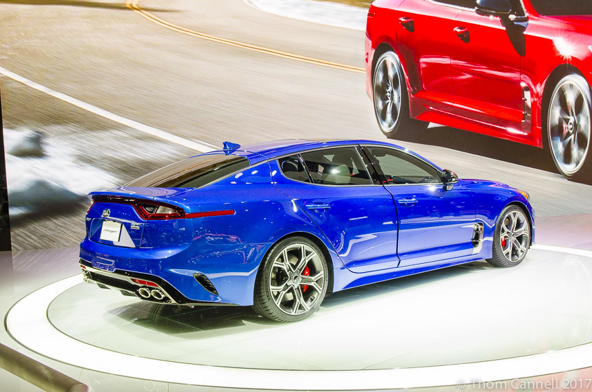 Kia revealed a new rear-wheel drive sedan with great performance cred called Stinger. With a solid 365 horsepower twin-turbo V6 supporting a 0-to-60 time of just over 5 seconds and forward-looking style this one may compete well with some of the German sport sedans, they hope. Stinger took the EyesOn Design award for best new production car.