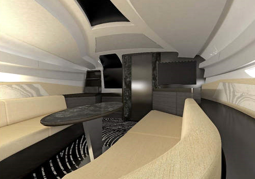 An integrated audio-video entertainment system is fully networked, with 4G WiFi & WAN. Sound reproduction is by Revolution Acoustics surface-mounted drivers using the ceiling panel as a transducer, powered by a Mark Levinson® Reference digital amplifier. SPECIFICATIONS, preliminary values: